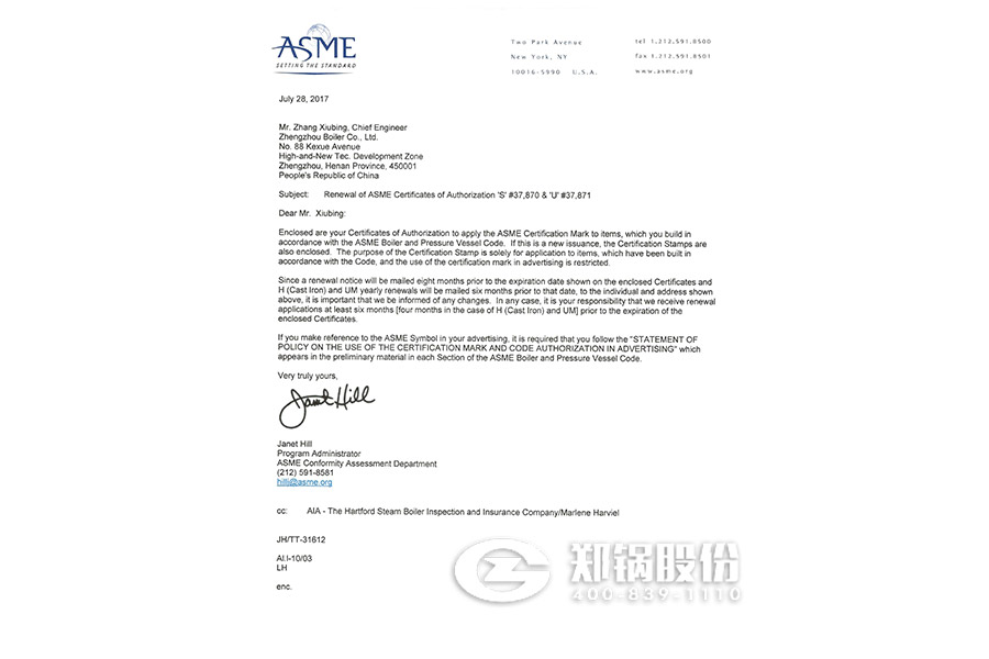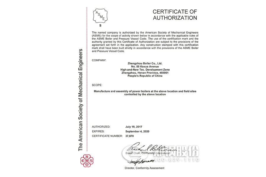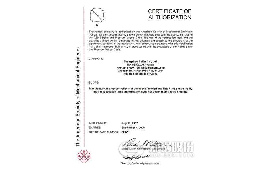 2017年7月,鄭鍋股份順利通過了ASME換證聯(lián)檢評審。聯(lián)檢組專家對鄭鍋股份進行了深入細致的評審后認為公司執(zhí)行標準情況符合ASME要求,準許換證。日前,美國機械工程師協(xié)會已向鄭鍋頒發(fā)新的ASME鋼印和授權(quán)證書,有效期自2017年7月19日至2020年9月4日。